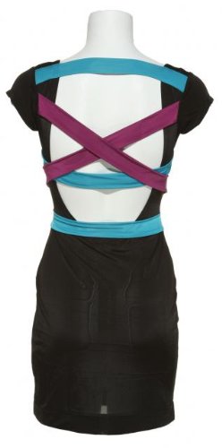 Rampage dress is constructed of a jersey knit fabrication with purple and blue straps that cross the deep back. Bottom of the dress is finished with a wide band. Measures approximately 32\" long from shoulder to hem. Subtly sheer throughout.